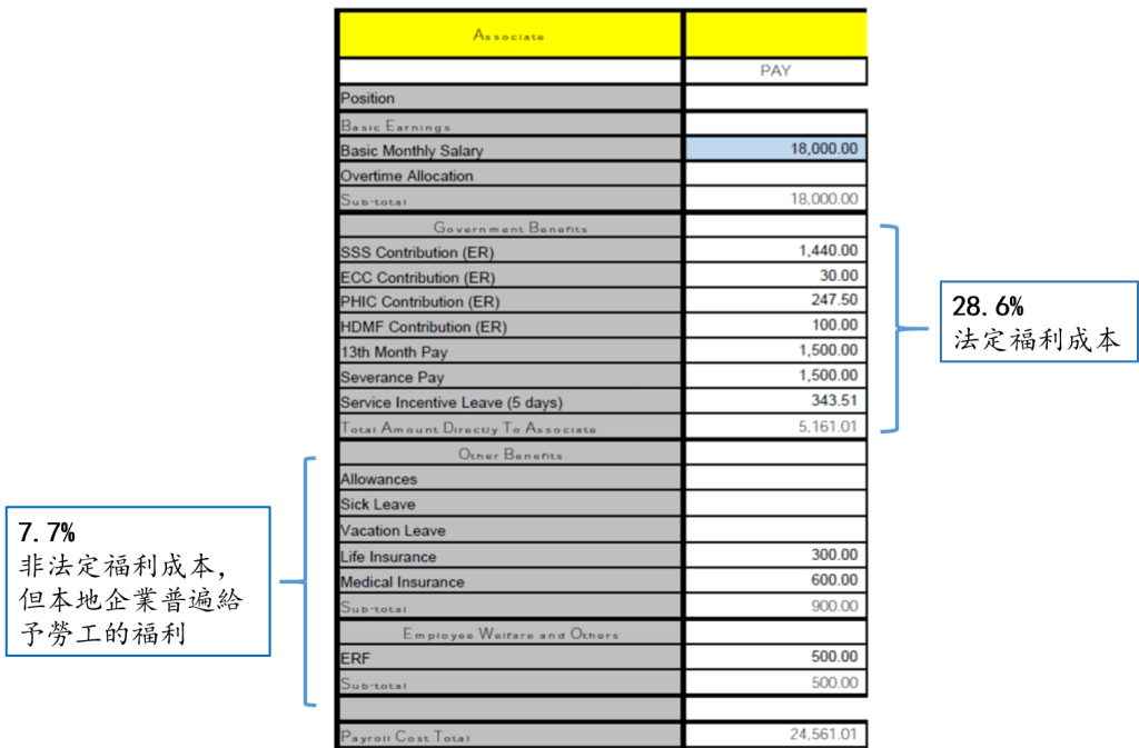 勞動成本的計算除了需要考慮基本工資外,還有所得稅及社保等需要納入考量。從下圖可以看出,如在菲律賓雇用一個基本工資₱18,000稅前月薪(注意:菲律賓採雙周薪)的勞工,計算上雇主需要負擔約28.6%的法定福利成本(包含社保SSS、住房公積金HDMF及健康保險PHIC等),再加上約7.7%本地企業普遍給與的非法定福利成本,人事成本的計算上應在基本工資外,額外計提約36.3%的人事成本。