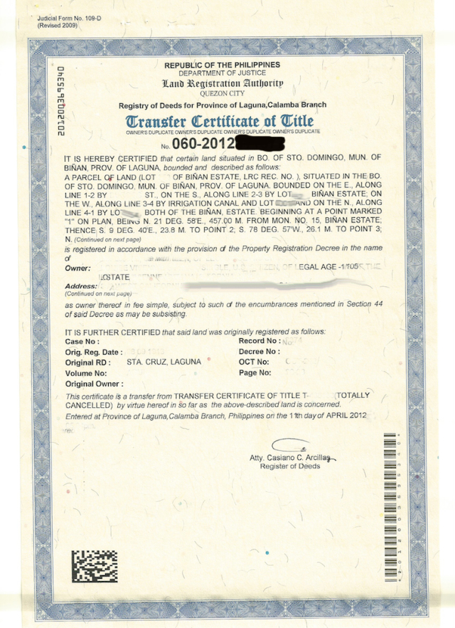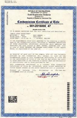 Note:房產證有兩種,請確認自己購買的房屋所有權是CCT(Condominium Certificate of Title)或是TCT(Transfer Certificate of Title)。區別在於,CCT僅表彰該菲律賓房產不帶土地的空間所有權(例如,位於該公寓19樓的某單元)。因此,如果您購買的是菲律賓公寓,則您所購買的權利應是CCT。 如果您購買的是土地或是帶有土地持分的菲律賓房地產,則必須取得TCT(所有權轉移證書)。