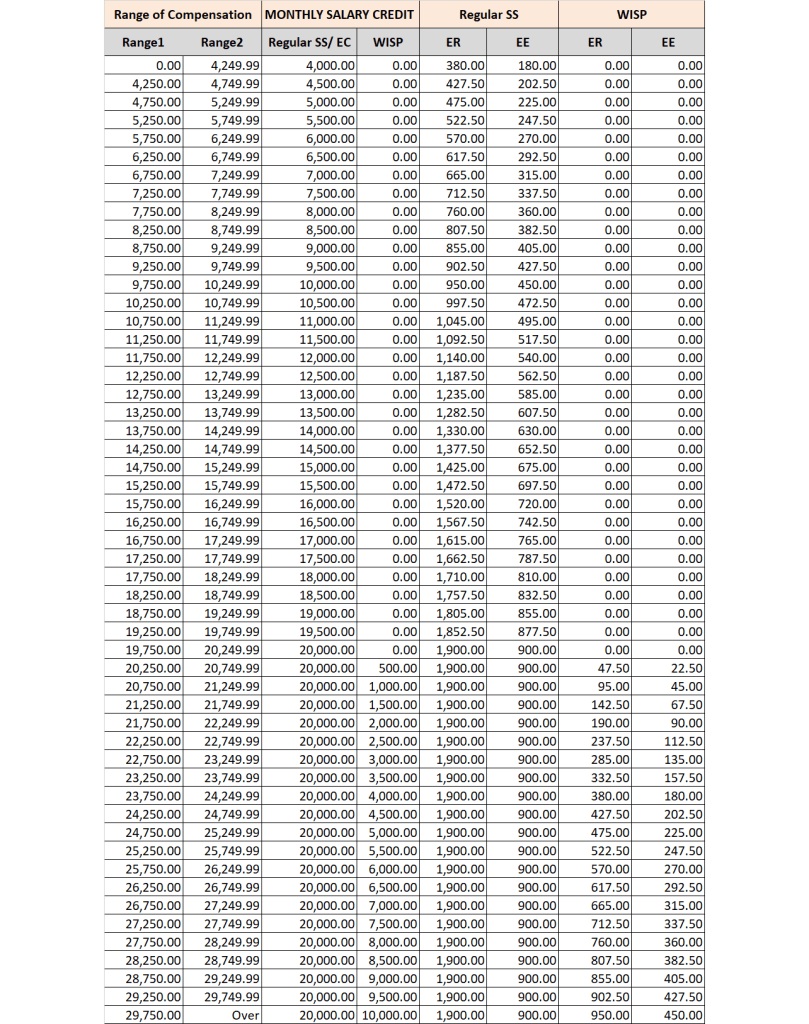 SSS應納總金額,由僱主繳納一部分(或稱ER),另一部分將從員工的工資中扣除並由雇主按月扣繳(或稱EE)。從2023年1月開始,菲律賓實施 14% 的社會保障繳費率,EE金額將增加;最低EE金額為Php180(2022年以前為 Php135),繳款上限仍為Php900。月薪低於Php4,250的人,最低應納總金額為Php560;月薪Php30,000以上的人,最低應納總金額為Php4,200。下圖為2023年SSS應納款項級距表: